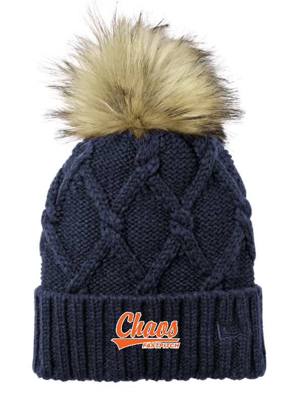 Totally on-trend this women's beanie has a thick ribbed cuff and a cable knit crown that's topped off by a fun faux fur pom. 100% acrylic Tonal embroidered New Era flag
