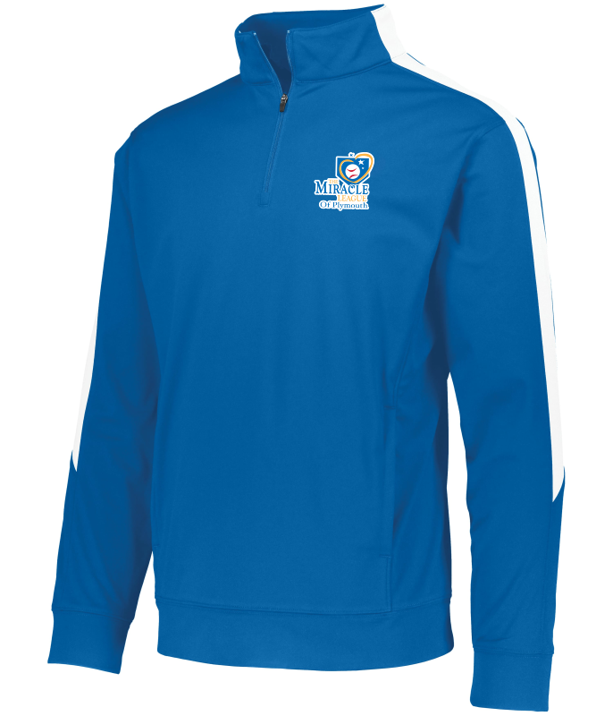 It features a quarter zip pullover style with contrast color inserts, set-in sleeves, and a front pouch pocket. The self-fabric cuffs and bottom band enhance fit and form. The heat-sealed label minimizes irritation, making it suitable for various sports and training environments.