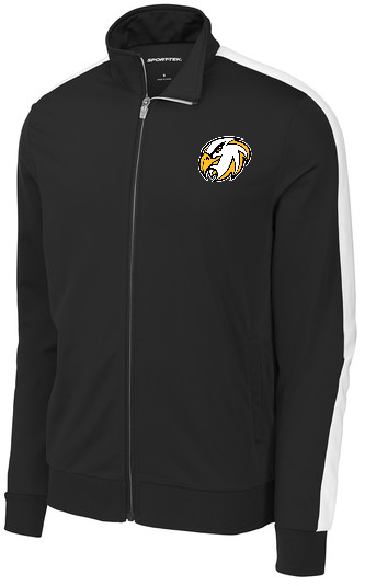 The classic tricot track jacket with pieced stripes and rib knit details. 100% polyester tricot 100% polyester rib knit cuffs and hem Soft-brushed backing Cadet collar Tag-free label Reverse coil zipper Pieced stripe on shoulders and sleeves Front pockets